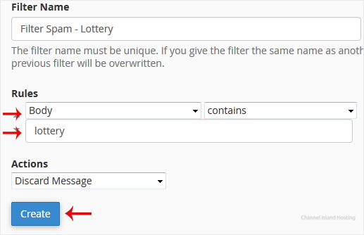 5. In the filter rules, you can filter email with many options, and should you want to deal with email, which contains a word like Lottery or other words, then in the first list box select Body and select Contains in the second list box.
